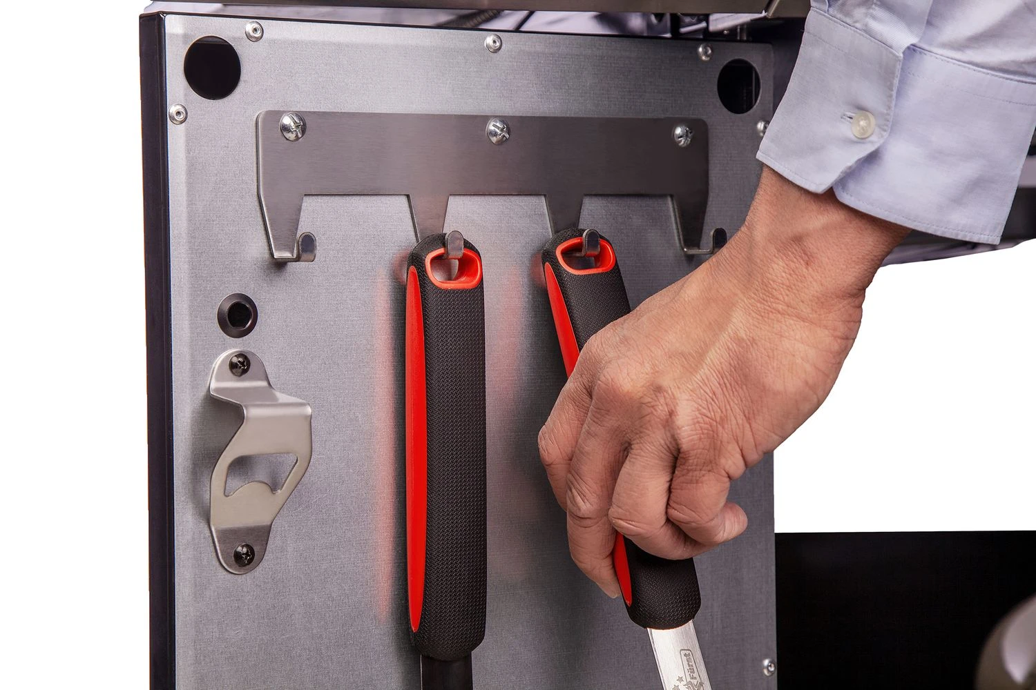 Auch der Unterschrank des Grills wird perfekt genutzt und somit befinden sich neben einer Aufnahme für 5kg, 8kg und 11kg Gasflaschen noch mehrere praktische Grillbesteck-Haken, sowie einen Flaschenöffner an der Innenseite der Tür.
